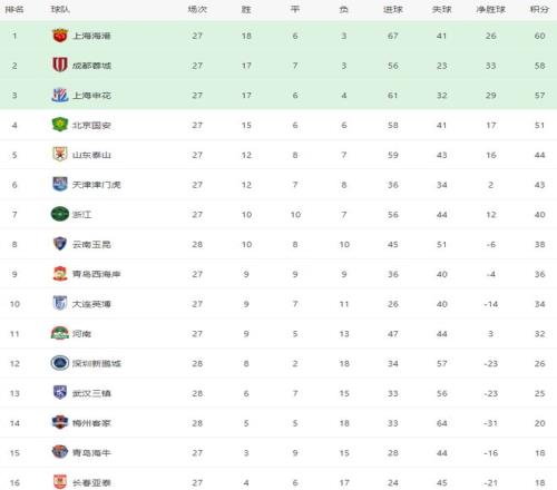 在积分榜上,上海海港以60分排名榜首。成都蓉城紧随其后,拿到58分。上海申花以57分排名第3。冠军的争夺还是非常激烈。虽然上海海港占据优势,但接下来的比赛不容有失,一旦丢分很可能就被挤下去。而保级形势也是比较乱。深圳新鹏城26分基本保级成功。武汉三镇25分排名第13。梅州客家拿到20分,排名倒数第3。长春亚泰以19分排名倒数第2。倒数第1的是青岛海牛,少踢1场,拿到18分。