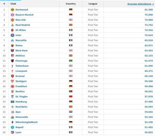 德转本赛季全球主场场均上座TOP25:多特拜仁前二,英博第18