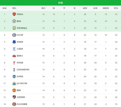 随着维拉21绝杀阿森纳+利物浦33!英超最新积分榜:曼城连胜