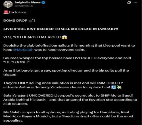 而据博主indykaila News(绿帽哥)独家消息称,利物浦已决定在一月份出售萨拉赫。利物浦高层对于萨拉赫的举动十分生气,直接表态:“他必须离开!”而萨拉赫对于离开持开放态度,包括为巴萨、皇马或拜仁效力。只要报价达到利物浦的心理价位,俱乐部便会立刻放萨拉赫走人,并迅速激活塞梅尼奥的解约条款作为替代!