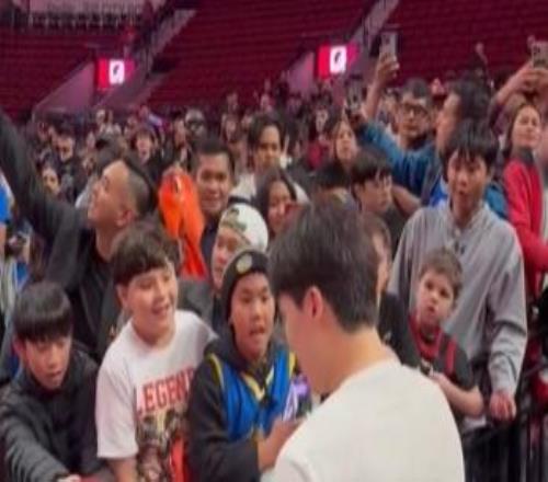 人气爆棚!大批球迷在通道等待杨瀚森,他将球鞋送给小球迷 -